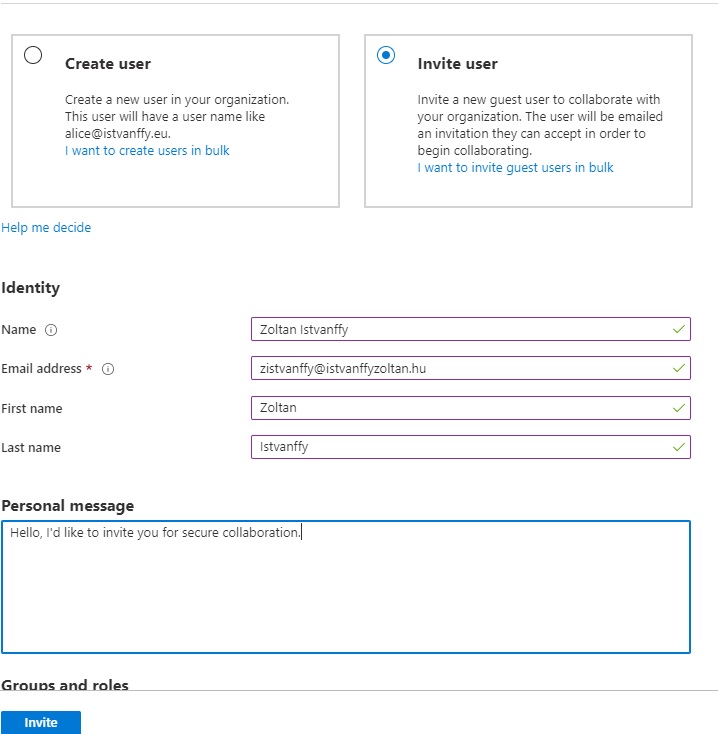 Az Azure AD B2B (business-to-business) lehetőségét kihasználva nagyon egyszerűen megoldható, hogy egy vállalati accounttal rendelkező külsőst meghívjunk (invite) guestként. Így lehetősége van a saját accountja használatára, nincs szükség külön regisztrációra, név/jelszó karbantartására.