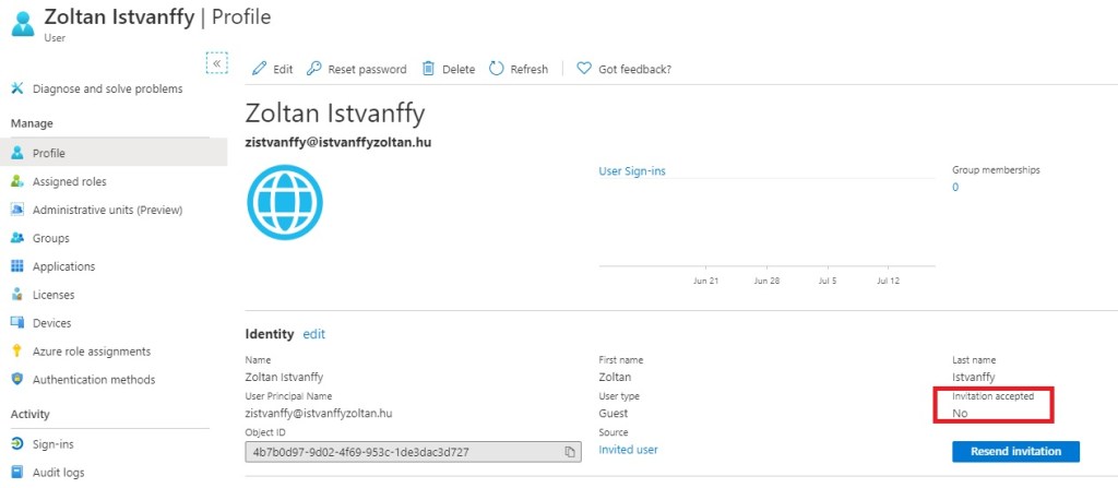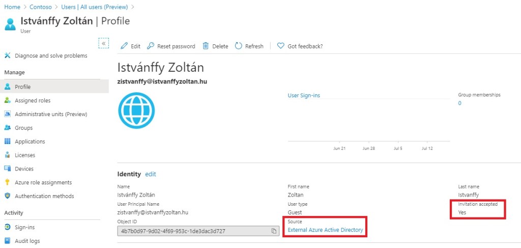 Ha újra megnézzük az Azure AD-ban a meghívott user adatlapját, már látható, hogy a regisztrációt megcsinálta, és példánkban egy külső Azure AD-tenantból érkezett.