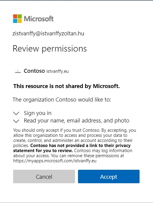 A bejelentkezés után kapunk egy beleegyezés-kérő ablakot, ami felsorolja, hogy milyen információkat kérne rólunk a meghívó szervezet (név, emailcím, esetleg fotó)