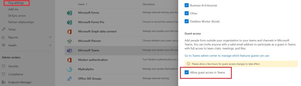 Az Office Admin Portalon, az Org Settings / Microsoft Teams részen kapcsolhatjuk be a guest accesst: