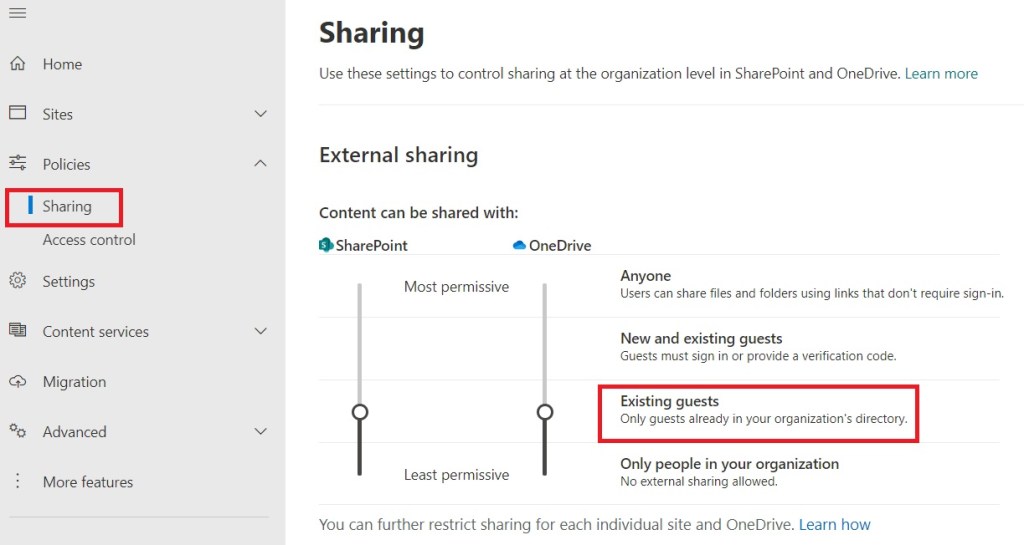 A Sharepoint Admin Centerben állítsuk be az External Sharing opciónól, hogy Existing guests only: