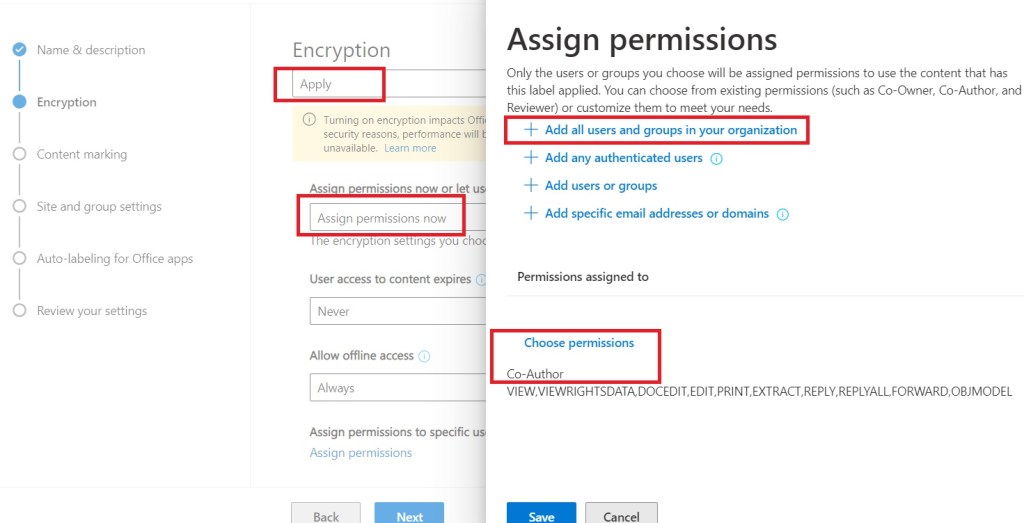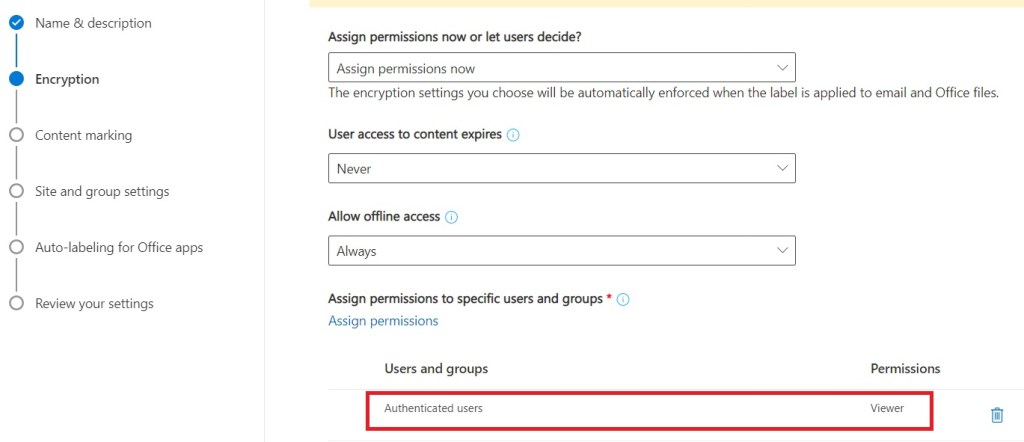 Ezeken túl van mód az információvédelmi megoldást is kiterjeszteni a külsősökre. A sensitivity labelek között kell egy olyan labelt definiálni, ahol a jogosultságot vagy “any authenticated users”-re állítjuk be (ilyenkor bárki, akinek van Azure AD, vagy Microsoft-accountja, hozzá tud férni az információhoz a megfelelő jogosultsággal (pl. Viewer, vagy egyedi beállításokkal, hogy ne tudjon a dokumentumból copyzni, printelni)