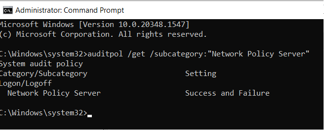 auditpol /set /subcategory:”Network Policy Server” /success:enable /failure:enable