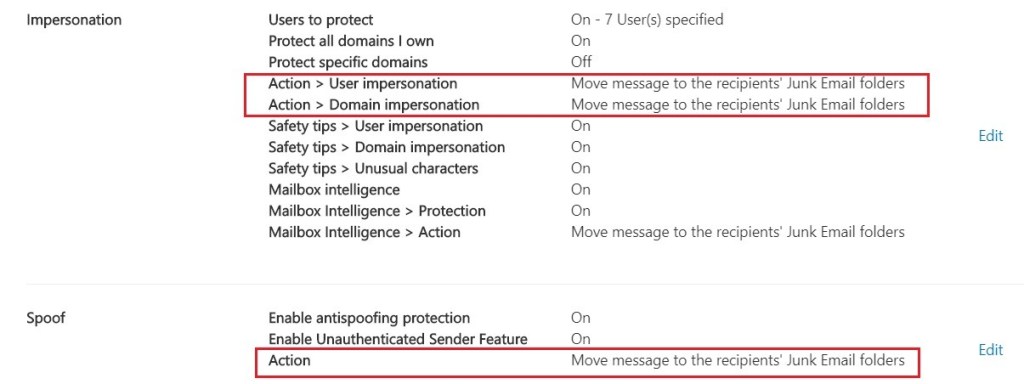 Belenézve az O365 ATP policykbe, amikkel kontrolláljuk a spoof-impersonated próbálkozásokat, a következő a beállítás: