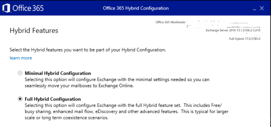 Fontos tudni, hogy ha már beállítottuk a Full Hybridet, akkor az O365 Hybrid Configuration Wizard futtatásakor már nem választhatjuk a Minimal Hybridet (a fenti screenshoton is inaktív a lehetőség). Viszont amennyiben Minimalt állítottunk be, bármikor válthatunk a Full Hybridre.