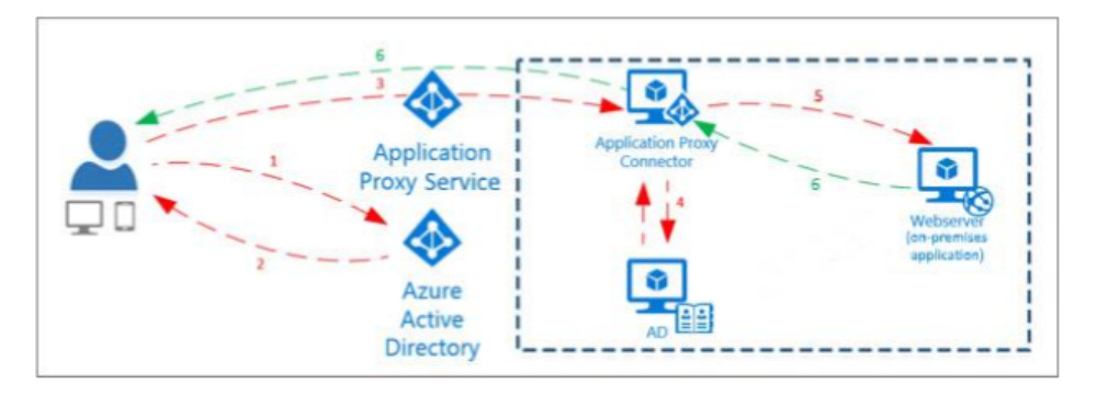 A felhasználó szeretné elérni a belső alkalmazást, először az Azure AD-hoz fordul. Az AAD továbbítja őt az Application Proxy Service-hez, ami kommunikál az előzőleg a földi környezetbe telepített Application Proxy Connectorral. Itt megtörténik az authentikáció és a felhasználó megkapja a hozzáférést.