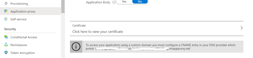 DNS beállítása: ahhoz, hogy az applikáció elérhető legyen az Azure AD-n keresztül, a DNS-t be kell állítani. Esetünkben definiálnunk kell, hogy a sharepoint.istvanffy.eu mutasson az Azure-re. Ezt CNAME-rekord létrehozással tudjuk megtenni, erre az Enterprise Application figyelmeztet is: