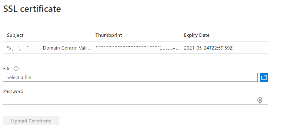 3rd party tanúsítvány feltöltése: ahhoz, hogy az applikációt a saját domainnevünkkel tudjuk elérni, szükséges egy harmadik féltől származó tanúsítvány feltöltése az Azure-be. Ezt a tanúsítványt fogja a hitelesítéshez használni és így biztosan nem kapunk böngésző-figyelmeztetéseket
