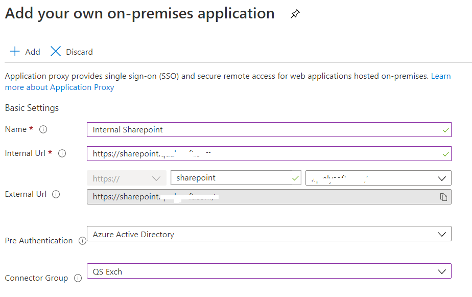 A Basic Settings résznél töltsük ki az Internal és External URL részeket. Ennél a példánál split-dns van, tehát a külső és belső névtér megegyezik. Így az internal és external url egyaránt https://sharepoint.istvanffy.eu lett. A pre-authentication legyen “Azure Active Directory”, a Connector Groupot pedig állítsuk be, ha szükséges (tesztkörnyezetben maradhat Default-on)