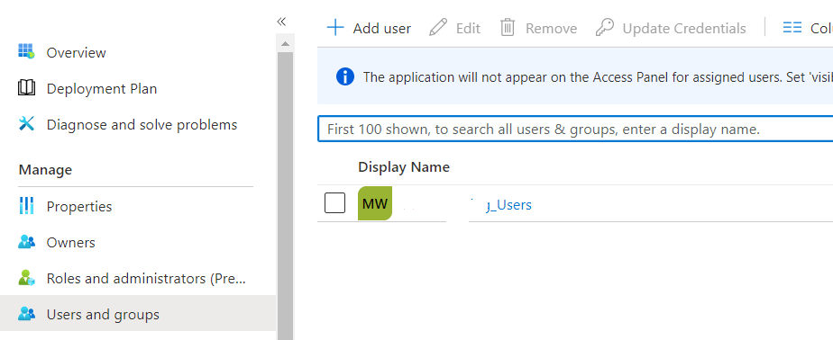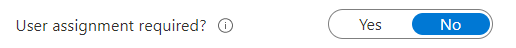 Az így elkészült alkalmazásnál a Properties résznél kapcsoljuk ki az “User assignment required” opciót.