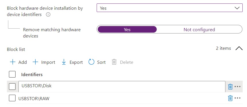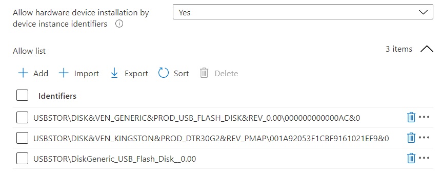 A gyakorlati példánkhoz elég ez a két érték. Most lássuk, hogyan valósítható meg Intune-managed gépeken esetén, hogy alapból tiltsunk minden USB-adathordozót, de specifikus eszközöket mégis engedélyezzünk.